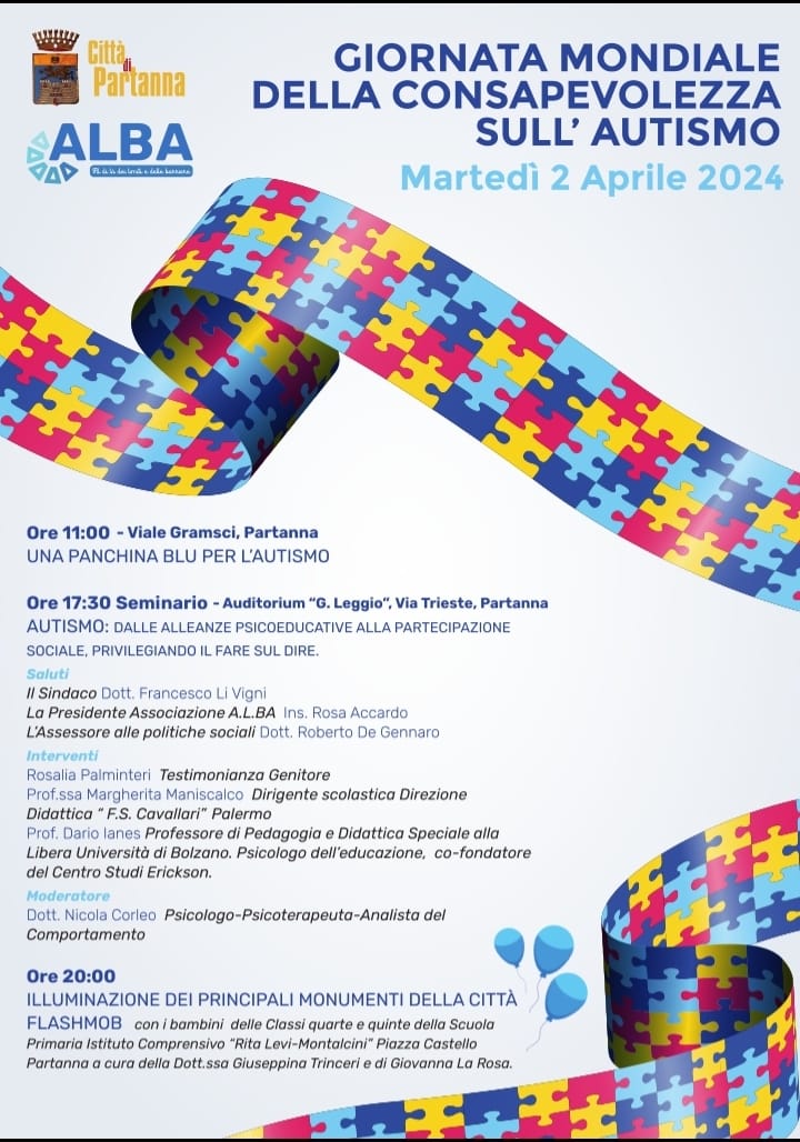 Per la Giornata Mondiale della consapevolezza dell'Autismo che si terrà martedì 2 aprile Partanna si muove per aumentare la consapevolezza sull'autismo e promuovere l'inclusione e la comprensione. Ad occuparsi di questo l'associazione ALBA che si muove sul territorio perché ha fatto dell'inclusione il faro della sui procedere. In virtù di questo l'associaizione con il patrocinio del Comune di Partanna, organizza una Giornata votata al blu. Tutta la Giornata è un evento, una vera opportunità per sensibilizzare l'opinione pubblica sull'importanza di garantire alle persone autistiche una vita piena e soddisfacente.È per questo al mattino si inaugura una panchina blu perché l'autismo merita una panchina tematica anche nel nostro comune, nel pomeriggio poi un convegno estremamente importante perché sarà ospite Dario Ianes, un luminare in ambito di inclusione e di autismo.