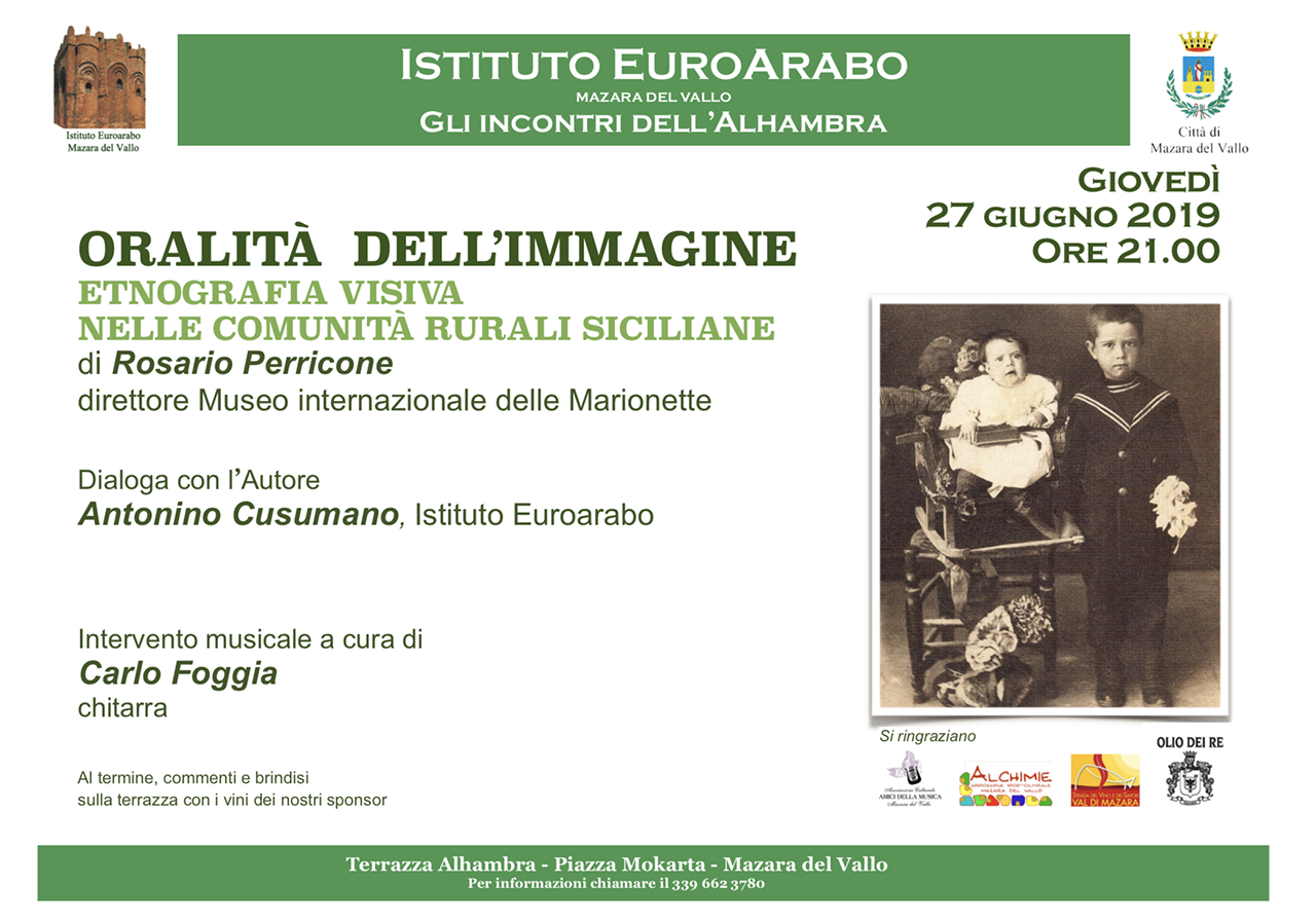 L’autore, pugliese d’origine, vive e lavora in Sicilia da circa vent’anni. La mostra è curata da Fabiola di Maggio, studiosa di antropologia dell’arte e dottore di ricerca in Studi Culturali e Visuali. Alle ore 21.00 nella terrazza dell’Alhambra sarà presentato il volume edito da Sellerio, Oralità dell’immagine. Etnografia visiva nelle comunità rurali siciliane di Rosario Perricone, direttore del Museo Internazionale delle Marionette e docente di antropologia culturale presso l’Accademia delle Belle Arti di Palermo.