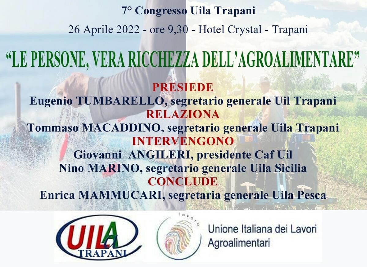 “Le persone, vera ricchezza dell’agroalimentare” sarà il tema del VII congresso Uila Trapani che si terrà domani, a partire dalle 9,30, nei locali del Crystal hotel di Trapani. A presiedere i lavori il segretario generale Uil Trapani Eugenio Tumbarello. Relazionerà il segretario generale Uila Trapani Tommaso Macaddino. Previsti gli interventi di Giovanni Angileri, presidente del Caf Uil, e di Nino Marino, segretario generale Uila Sicilia. Dopo il dibattito, concluderà i lavori il segretario generale Uila Pesca Enrica Mammucari.