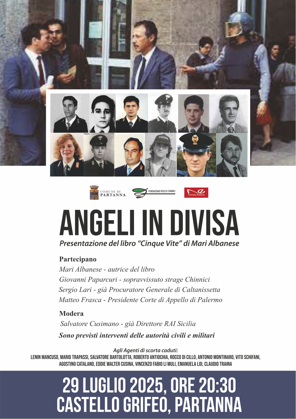 Il Comune di Partanna invita la cittadinanza alla presentazione del libro “Cinque Vite” di Mari Albanese, in programma martedì 29 luglio alle ore 20:30 presso il Castello Grifeo di Partanna. L’evento, dal titolo “Angeli in Divisa”, è promosso dal Comune di Partanna in collaborazione con la Fondazione Rocco Chinnici e Navarra Editore, e vedrà la partecipazione di importanti ospiti: Mari Albanese, autrice del libro; Giovanni Paparcuri, sopravvissuto alla strage Chinnici; Sergio Lari, già Procuratore Generale di Caltanissetta; Matteo Frasca, Presidente della Corte di Appello di Palermo.