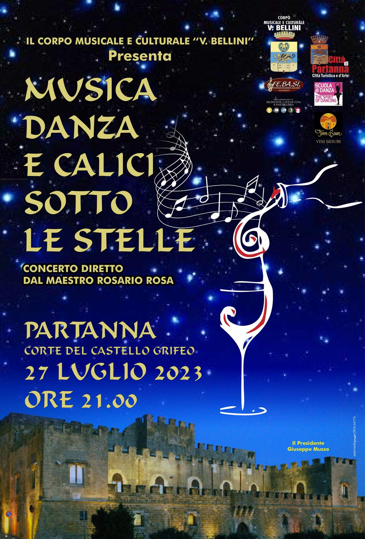 Metti insieme musica, danza e calici di vino e viene fuori il concerto pensato dal Corpo musicale e culturale Vincenzo Bellini di Partanna. A dirigere sarà il maestro Rosario Rosa che da cinque anni segue con successo la formazione musicale del complesso bandistico. Lo spettacolo, con il patrocinio del Comune di Partanna, si terrà nella splendida cornice della Corte del Castello Grifeo di Partanna e avrà la partecipazione straordinaria della Scuola di danza The Spirit the dancing di Giovanna La Rosa; a deliziare il palato penserà l'Azienda Agricola Terre Scure con la degustazione di vini “Siduri”. Non resta che invitare la cittadinanza a essere presente all'evento del 27 luglio 2023 alle ore 21:00 per poter trascorrere una splendida serata sotto le stelle.