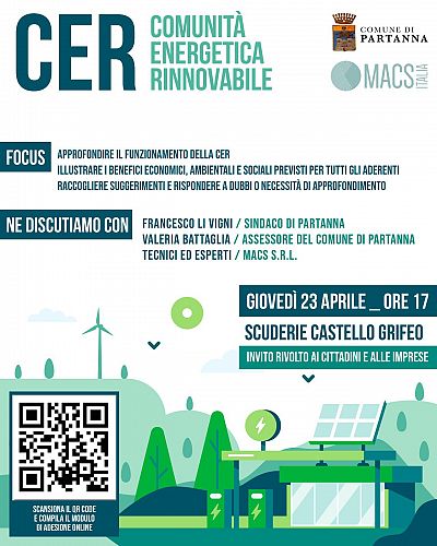 Il Comune di Partanna organizza un incontro dedicato alla Comunità Energetica Rinnovabile (CER), in programma giovedì 23 aprile alle ore 17.00 presso le Scuderie del Castello Grifeo.