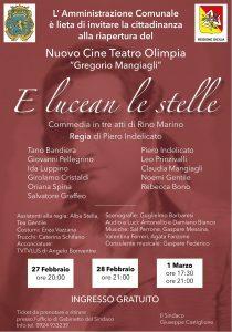 Il Nuovo Cinema Olimpia sarà intitolato al compianto Gregorio Mangiagli, professionista campobellese prematuramente scomparso nel 2014, molto amato da tutti e protagonista indimenticabile di questo teatro, che ha calcato per anni e anni, divertendo il pubblico con il suo unico e spontaneo modus teatrandi. La cerimonia di inaugurazione, in particolare, si articolerà in tre giornate, il 27 e il 28 febbraio e il 1° marzo prossimi, durante le quali sarà portata in scena l’opera teatrale “E Lucean le stelle” per la regia di Piero Indelicato, regista e attore di Campobello, che annovera 35 anni di qualificata attività artistica in campo teatrale, essendo da anni impegnato in modo particolare nella promozione del teatro sociale per la lotta contro la mafia e contro ogni forma di sopruso e di violenza.