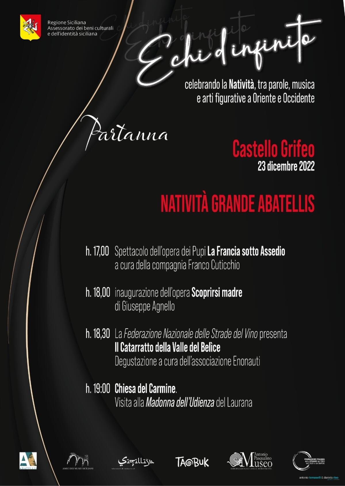 Con un programma che unisce musica gospel e letteratura, mostre e approfondimenti, opera dei pupi ed enogastronomia, parte la rassegna “Echi d’infinito” promossa dalla Regione Siciliana attraverso l’assessorato dei Beni culturali e dell’identità siciliana. Il cartellone esalterà il valore universale del Natale attraverso parole, musica e arte con otto appuntamenti in luoghi dalla straordinaria portata storico-culturale: dall’oratorio di San Lorenzo e dalla chiesa di Santa Caterina a Palermo al Teatro Massimo Bellini di Catania e al Museo Interdisciplinare di Messina.