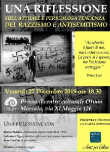 Oggi alle ore 18,30 presso il centro culturale "Otium", a Marsala (via XI Maggio n.126) si svolgerà “Una riflessione sull’attuale pericolosa tendenza del razzismo e dell’antisemitismo”. L’incontro-dibattito è stato organizzato dall’associazione “Amici della Cultura”. Il tema è stato scelto a seguito all'apparizione negli ultimi mesi di svastiche e croci celtiche sulle mura del centro storico lilibetani. Come se non bastasse la crescente escalation di odio manifestata sui social network.