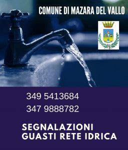 L’Ufficio Idrico rende noto che a seguito di un guasto nella condotta dell’acqua della zona Santa Maria di Gesù si sono verificati disagi idrici in particolare nelle vie Petrarca, Tasso e adiacenti. I tecnici sono al lavoro per la riparazione del guasto e confidano di risolvere il problema al più presto. Per segnalazioni guasti e richieste interventi è possibile contattare i numeri mobili 3495413684 e 3479888782 oppure il numero fisso 0923671521 - dal lunedì al venerdì dalle 8 alle 13 e nelle giornate di lunedì e mercoledì anche dalle ore 15 alle ore 18.