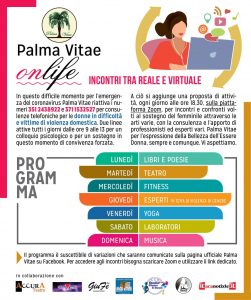 Nasce Palma Vitae OnLife, incontri tra reale e virtuale, su una piattaforma interattiva dove, la modalità online, diventa contatto vitale a distanza, scambio, condivisione, confronto. Abbiamo creato uno spazio di attività varie, tra l’arte, il benessere e la bellezza, con momenti dedicati a specialisti sulla violenza di genere e con la possibilità della consulenza legale dell’associazione nazionale Gens Nova. Insieme all’attrice e regista Luana Rondinelli, socia onoraria di Palma Vitae, da sempre impegnata nelle tematiche sociali importanti tra cui il contrasto alla violenza di genere, abbiamo fatto un calendario settimanale con eventi previsti tutti i giorni alle ore 18,30 sulla piattaforma Zoom, con attività di vario genere che guardano al femminile e non solo.