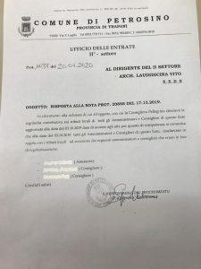 Questa è la risposta alla mia nota del 17/12/2019 dove chiedevo di saper come era la situazione contributiva alla data della mia prima nota e cioè del 03/10/2019, infatti i due consiglieri comunali e l’assessore hanno regolarizzato la loro posizione contributiva solo dopo e grazie alla mia nota del 03/10/2019. Chi amministra una città non deve essere invitato a pagare ma deve essere il primo a farlo, deve essere da esempio per i propri cittadini, ma a Petrosino probabilmente questo non vale.