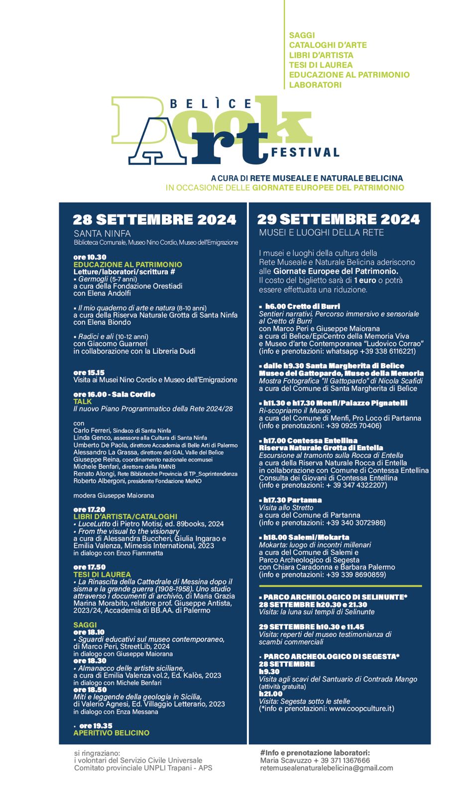 La prima giornata si terrà a Santa Ninfa, sabato 28 settembre, nelle sale del Museo Nino Cordio, del Museo dell’Emigrazione e della Biblioteca Comunale. A partire dalle 10.30 avranno inizio letture sull’educazione al patrimonio, dedicate ai più piccoli. Alle 16 prenderà il via il talk dal titolo “Piano Programmatico della Rete 2024/28”, con la presenza di Carlo Ferreri, sindaco di Santa Ninfa, Linda Genco, assessore alla Cultura di Santa Ninfa, Umberto De Paola, direttore Accademia delle Belle Arti di Palermo, Alessandro La Grassa, direttore del Gal Valle del Belìce, Giuseppe Reina, coordinamento nazionale Ecomusei, Michele Benfari, direttore della Rete Museale e Naturale Belicina, Renato Alongi, Rete Biblioteche Provincia di Trapani e Soprintendenza, Roberto Albergoni, presidente Fondazione MENO. A seguire si passerà alle presentazioni di libri d’artista e cataloghi: “LuceLutto” di Pietro Motisi; “From the visual to the visionary”, a cura di Alessandra Buccheri, Giulia Ingarao e Emilia Valenza; “Sguardi educativi sul museo contemporaneo”, di Marco Peri; “Almanacco delle artiste siciliane”, a cura di Emilia Valenza; “Miti e leggende della geologia in Sicilia”, di Valerio Agnesi; e la tesi di laurea dal titolo “La Rinascita della Cattedrale di Messina dopo il sisma e la grande guerra (1908-1958)”, di Maria Grazia Marina Morabito.L’indomani, domenica 29 settembre, sono previste diverse visite guidate nei musei e nei luoghi della Rete, a cominciare da un appuntamento molto suggestivo all’alba sul Cretto di Burri, dove dalle ore 6 si potrà prendere parte a “Sentieri narrativi”, un percorso immersivo e sensoriale nel sito simbolo del terremoto nella Valle del Belice del 1968, con Marco Peri e Giuseppe Maiorana.