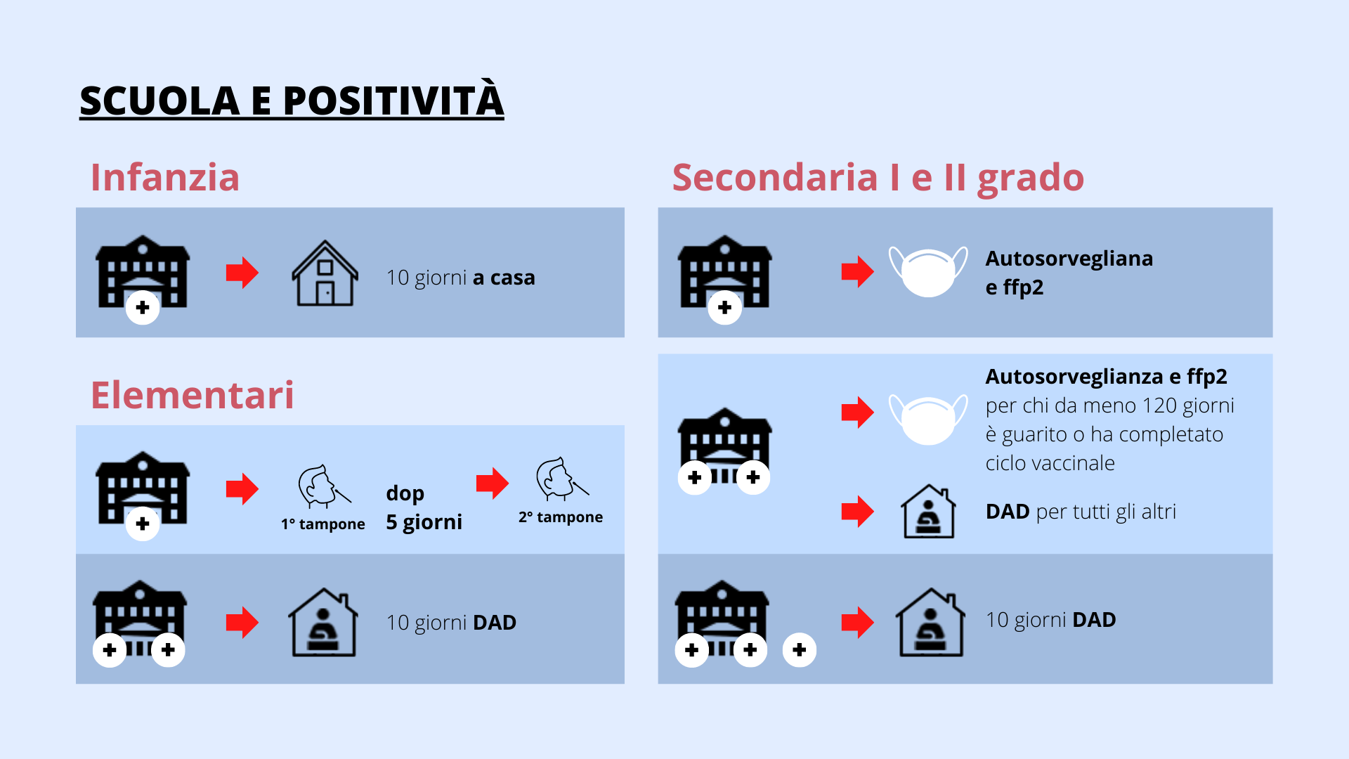In generale per gli alunni tra 0 e 6 anni è stato deciso il massimo della tutela, mentre per i più grandi tutta la classe andrà in Dad con tre positivi.